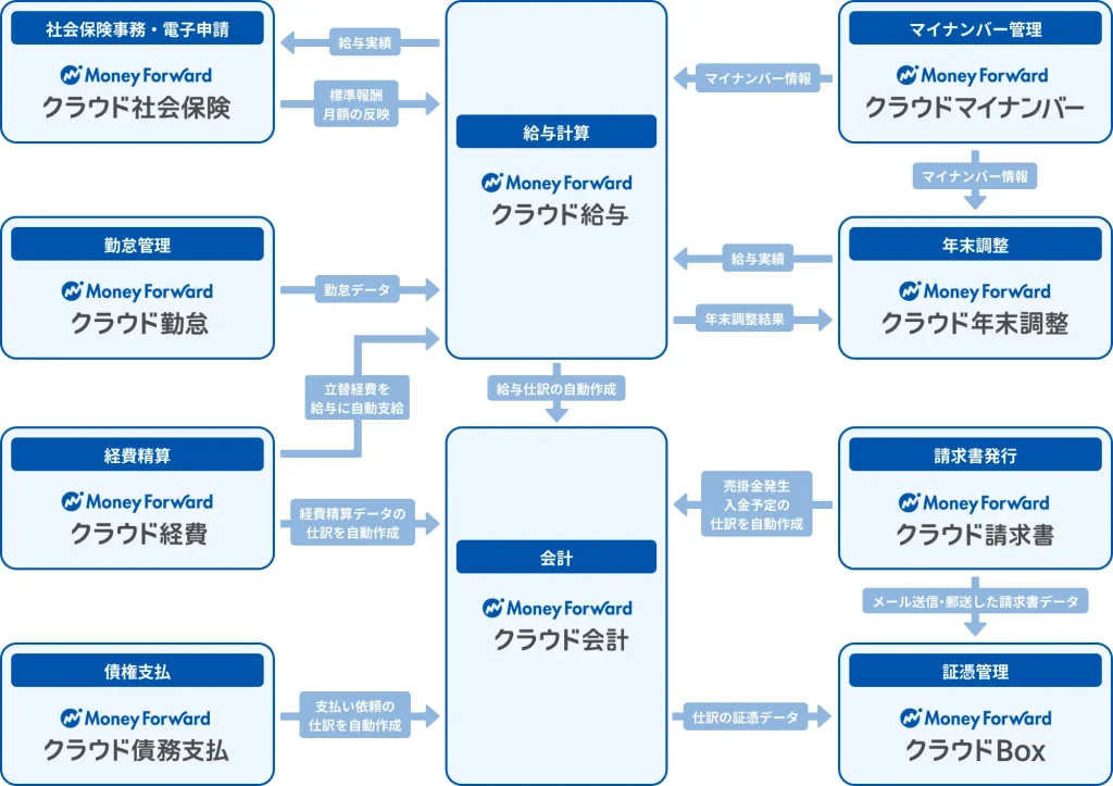 通常なら、給与計算アプリはA社、勤怠管理はB社、経費関連はC社など個別での契約が必要ですが、マネーフォワードクラウドなら1つの契約で全て管理できます。経理財務から人事労務までの全11サービスが利用可能です。